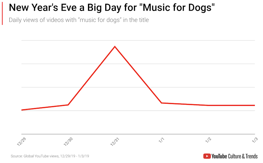 For example, many people use ASMR and guided meditation videos for mood regulation. Mood regulation isn’t just for humans, though. Music for dogs was created to help calm canines during stressful moments, which is why views of videos related to music for dogs peaked on July 4 and December 31. Daily views of music-for-dogs videos increased 33% this past New Year's Eve.