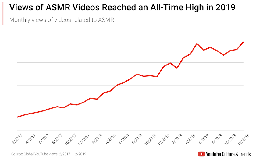 In 2019, we witnessed growth in videos designed to engage senses other than sight. ASMR videos — videos purported to cause pleasurable tingles in the nervous systems of people who are receptive — experienced all-time highs in uploads and views in 2019.