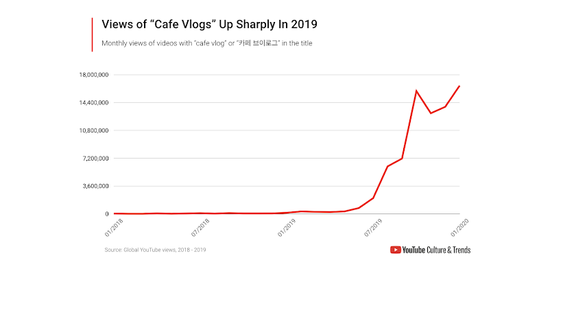 - Uploads of videos with “cafe vlog” or “카페 브이로그” in the title increased more than 10x from 2018