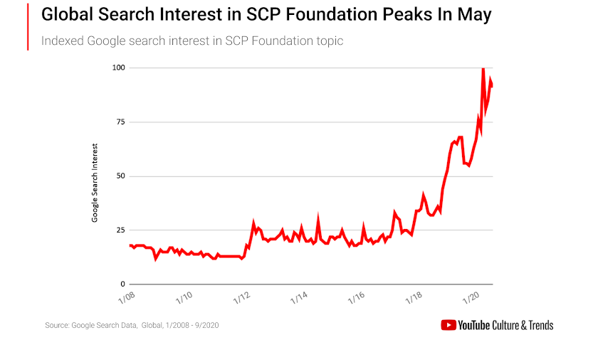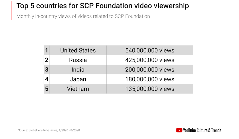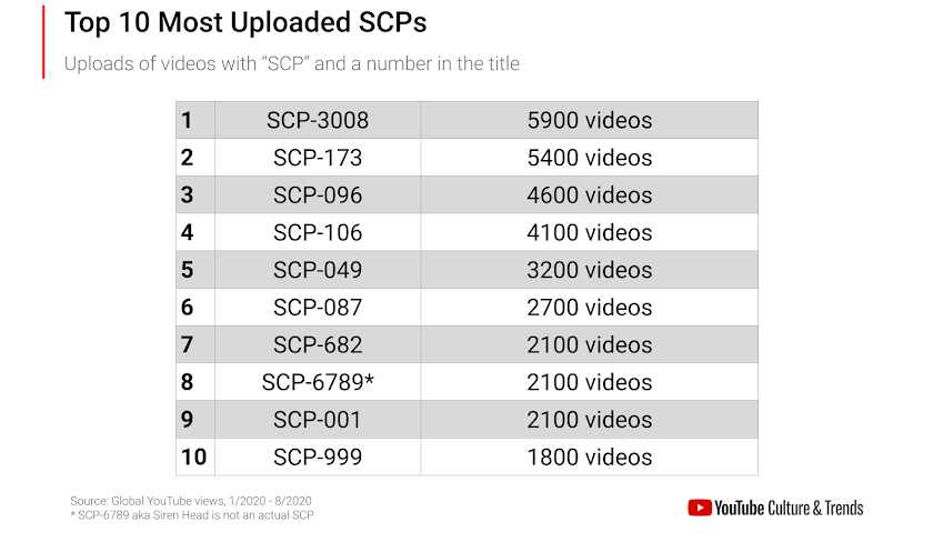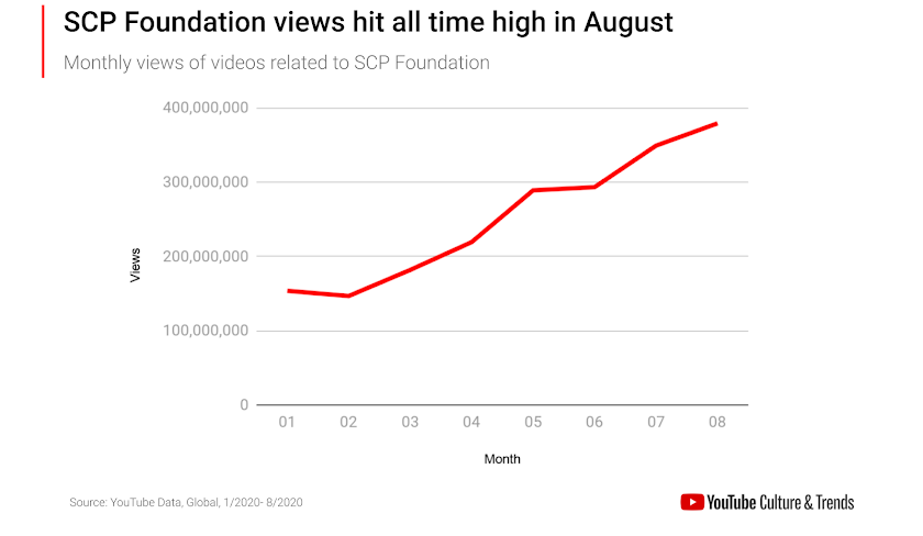 Source: Global YouTube views, 1/2020 - 8/2020 * SCP-6789 aka Siren Head is not an actual SCP