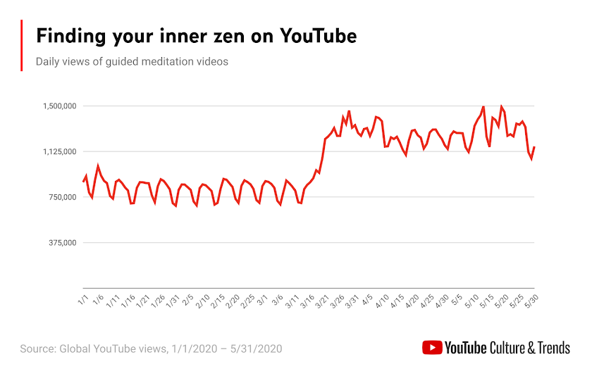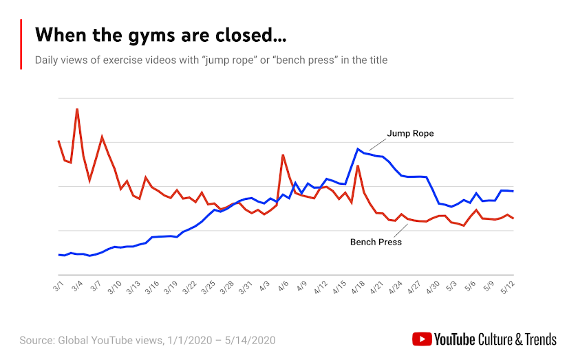 While the world was gripped by the onset of the pandemic last spring, people turned to YouTube to adapt, cope and find community. As the weeks of lockdown rolled by, we periodically looked to see what trends were emerging by investigating categories where we were most likely to see changes -- fitness, well-being, food, etc. The data points presented here are just a sample of the many trends to come out of this unprecedented time on the platform, but together they provide an idea of how human behaviors and priorities shifted in the face of a singular global crisis.
