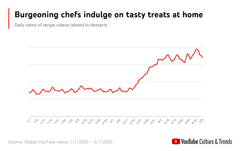 Food and cooking were categories where we saw pronounced changes early on in the pandemic. Even seven weeks after the WHO officially described COVID-19 as a pandemic, culinary creativity and pining for comfort foods was still going strong.